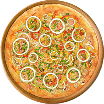Основа: Традиционная (толстое тесто ⌀35см) (650 г) Соус: Соус красный (100 г) Топпинги: Ветчина (50 г), Курица копченая (50 г), Шампиньоны (50 г), Сырное ассорти (50 г), Болгарский перец (50 г) Доп. топпинги: Кунжут (10 г), Лук репчатый (35 г)