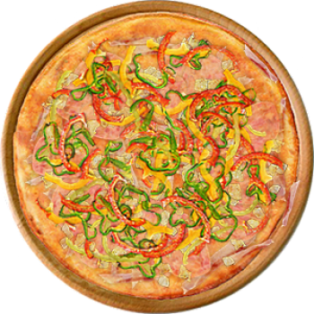Основа: Итальянская (тонкое тесто ⌀35см) (400 г) Соус: Соус красный (100 г) Топпинги: Бекон (50 г), Ветчина (50 г), Курица копченая (50 г), Сыр (50 г), Болгарский перец (50 г) Доп. топпинги: - нет -