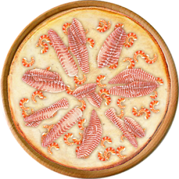 Основа: Итальянская (тонкое тесто ⌀35см) (400 г) Соус: Соус белый (100 г) Топпинги: Креветки (50 г), Окунь (филе) (100 г) Доп. топпинги: - нет -