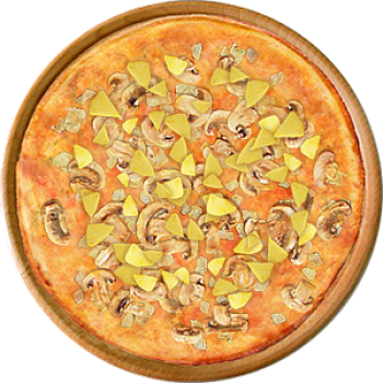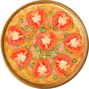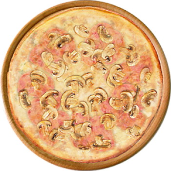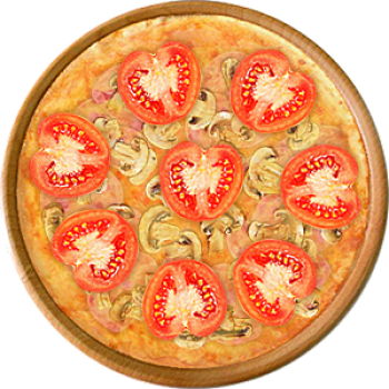 Основа: Традиционная (толстое тесто ⌀35см) (650 г) Соус: Соус красный (100 г) Топпинги: Сырное ассорти (50 г), Шампиньоны (100 г), Ветчина (150 г), Помидоры (150 г) Доп. топпинги: - нет -
