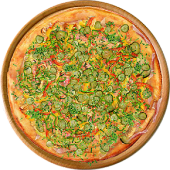 Основа: Итальянская (тонкое тесто ⌀35см) (400 г) Соус: Соус красный (100 г) Топпинги: Бекон (50 г), Салями (50 г), Грибное ассорти (50 г), Сырное ассорти (50 г), Болгарский перец (50 г), Огурчики (50 г) Доп. топпинги: Зелень (10 г)