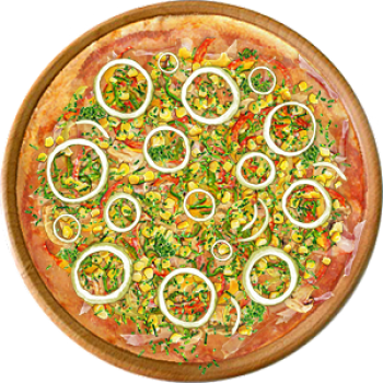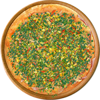 Основа: Традиционная (толстое тесто ⌀35см) (650 г) Соус: Соус чили (100 г) Топпинги: Бекон (50 г), Грудинка (50 г), Сырное ассорти (50 г), Болгарский перец (50 г), Кукуруза (50 г), Шампиньоны (100 г) Доп. топпинги: Зелень (10 г), Лук репчатый (35 г)
