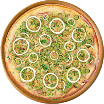 Основа: Итальянская (тонкое тесто ⌀35см) (400 г) Соус: Соус белый (100 г) Топпинги: Бекон (50 г), Курица копченая (50 г), Шампиньоны (50 г), Сырное ассорти (50 г), Огурчики (50 г) Доп. топпинги: Зелень (10 г), Лук репчатый (35 г)