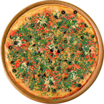 Основа: Итальянская (тонкое тесто ⌀35см) (400 г) Соус: Соус красный (100 г) Топпинги: Балык (50 г), Ветчина (50 г), Грибное ассорти (50 г), Сырное ассорти (50 г), Маслины (50 г), Помидоры (100 г) Доп. топпинги: Зелень (10 г), Лук зелёный (20 г)