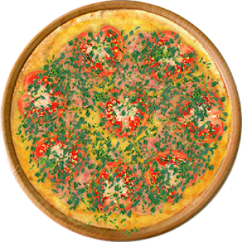 Основа: Традиционная (толстое тесто ⌀35см) (650 г) Соус: Соус сырный (100 г) Топпинги: Ветчина (50 г), Сыр (50 г), Помидоры (50 г) Доп. топпинги: Зелень (10 г), Лук зелёный (20 г)