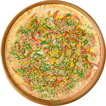 Основа: Традиционная (толстое тесто ⌀35см) (650 г) Соус: Соус белый (100 г) Топпинги: Ветчина (50 г), Грудинка (50 г), Сырное ассорти (50 г), Болгарский перец (50 г) Доп. топпинги: Зелень (10 г), Кунжут (10 г)