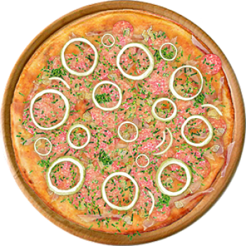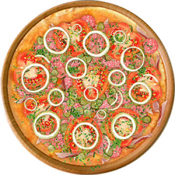 Основа: Традиционная (толстое тесто ⌀35см) (650 г) Соус: Соус красный (100 г) Топпинги: Бекон (50 г), Ветчина (50 г), Копченые колбаски (50 г), Салями (50 г), Огурчики (50 г), Помидоры (50 г) Доп. топпинги: Зелень (10 г), Лук репчатый (35 г)