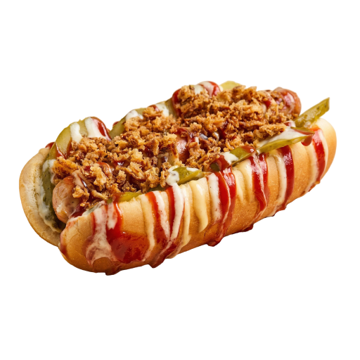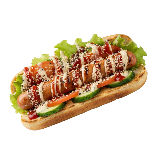 сосиска,сырный соус,кетчуп,салат,пеперони,кунжут =)
