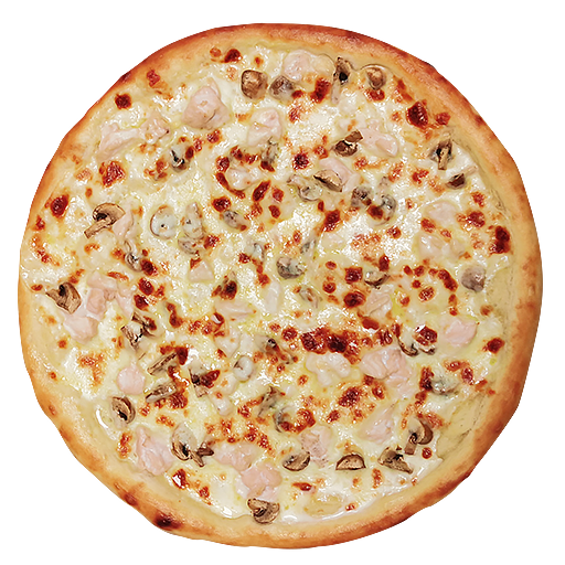Тонкое тесто ,соус белый,соус белый ,сыр ,шампиньоны, курица,