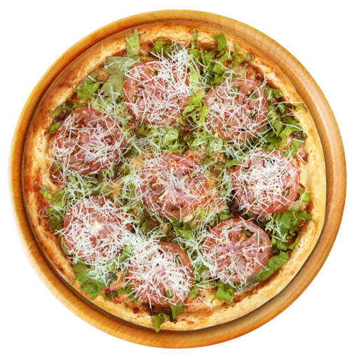 Толстое тесто, соус красный, сыр моцарелла, зеленый салат, помидоры, сырное ассорти