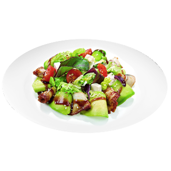 Копчёный угорь, огурец, mix салата, помидоры, соус Унаги, кунжут