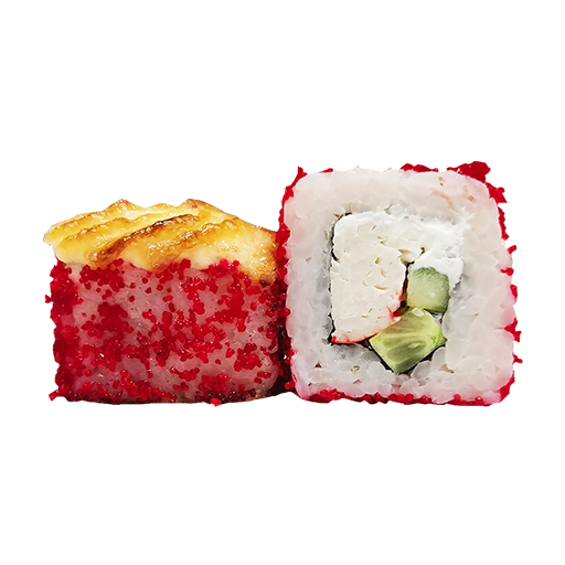 Рис, нори, снежный краб, огурец, сливочный сыр, тобико, сырная шапочка