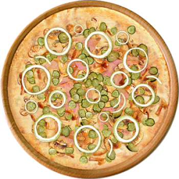 Основа: Традиционная (толстое тесто ⌀35см) (650 г) Соус: Соус белый (100 г) Топпинги: Грибное ассорти (50 г), Сыр (50 г), Огурчики (50 г), Балык (100 г) Доп. топпинги: Лук репчатый (35 г)