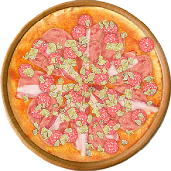 Основа: Традиционная (толстое тесто ⌀35см) (650 г) Соус: Соус красный (100 г) Топпинги: Грудинка (50 г), Копченые колбаски (50 г), Курица копченая (50 г), Ветчина (100 г) Доп. топпинги: - нет -