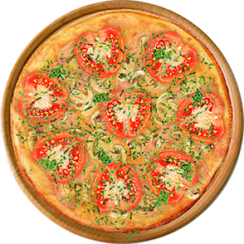 Основа: Итальянская (тонкое тесто ⌀35см) (400 г) Соус: Соус красный (100 г) Топпинги: Ветчина (50 г), Шампиньоны (50 г), Сырное ассорти (50 г), Помидоры (50 г) Доп. топпинги: Зелень (10 г)