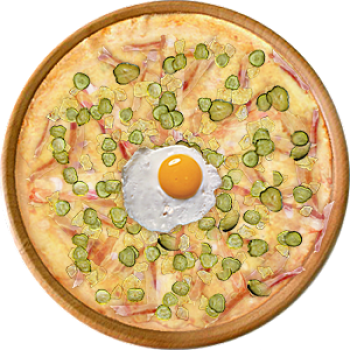Основа: Традиционная (толстое тесто ⌀35см) (650 г) Соус: Соус белый (100 г) Топпинги: Бекон (50 г), Грудинка (50 г), Курица копченая (50 г), Огурчики (50 г), Сырное ассорти (100 г), Яйцо куриное (100 г) Доп. топпинги: - нет -