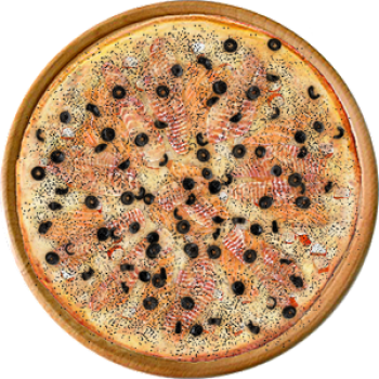 Основа: Итальянская (тонкое тесто ⌀35см) (400 г) Соус: Соус белый (100 г) Топпинги: Крабовые палочки (50 г), Маслины (50 г), Лосось (100 г), Окунь (филе) (150 г), Сыр (150 г) Доп. топпинги: Чёрный перец (10 г)