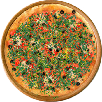 Основа: Традиционная (толстое тесто ⌀35см) (650 г) Соус: Соус красный (100 г) Топпинги: Ветчина (50 г), Салями (50 г), Грибное ассорти (50 г), Шампиньоны (50 г), Сыр (50 г), Болгарский перец (50 г), Помидоры (50 г), Маслины (50 г) Доп. топпинги: Зелень (10 г), Лук зелёный (20 г)