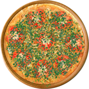 Основа: Традиционная (толстое тесто ⌀35см) (650 г) Соус: Соус красный (100 г) Топпинги: Курица копченая (50 г), Грибное ассорти (50 г), Сыр Филадельфия (50 г), Сырное ассорти (50 г), Картофель фри (50 г), Помидоры (50 г) Доп. топпинги: Зелень (10 г), Лук зелёный (20 г)