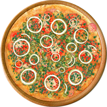 Основа: Традиционная (толстое тесто ⌀35см) (650 г) Соус: Соус красный (100 г) Топпинги: Копченые колбаски (50 г), Салями (50 г), Грибное ассорти (50 г), Сырное ассорти (50 г), Брокколи (50 г), Огурчики (50 г), Помидоры (50 г) Доп. топпинги: Лук зелёный (20 г), Лук репчатый (35 г)