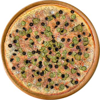 Основа: Итальянская (тонкое тесто ⌀35см) (400 г) Соус: Соус белый (100 г) Топпинги: Крабовые палочки (50 г), Креветки (50 г), Окунь (филе) (50 г), Огурчики (50 г), Маслины (50 г), Лосось (100 г), Сыр (150 г) Доп. топпинги: Чёрный перец (10 г)