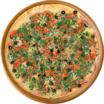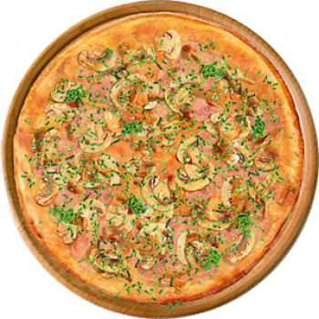 Основа: Итальянская (тонкое тесто ⌀35см) (400 г) Соус: Соус красный (100 г) Топпинги: Ветчина (50 г), Грибное ассорти (50 г), Сыр (50 г) Доп. топпинги: Зелень (10 г)