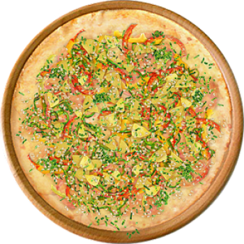 Основа: Традиционная (толстое тесто ⌀35см) (650 г) Соус: Соус белый (100 г) Топпинги: Болгарский перец (50 г), Ветчина (100 г), Сырное ассорти (100 г), Ананасы (100 г) Доп. топпинги: Зелень (10 г), Кунжут (10 г)