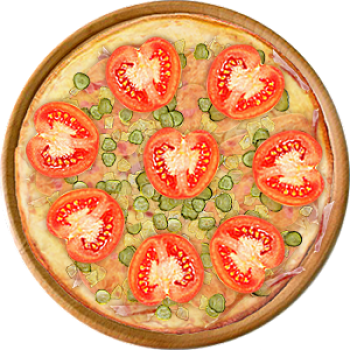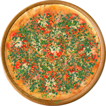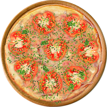 Основа: Традиционная (толстое тесто ⌀35см) (650 г) Соус: Соус красный (100 г) Топпинги: Ветчина (50 г), Шампиньоны (50 г), Сыр (50 г), Помидоры (50 г) Доп. топпинги: Зелень (10 г), Лук зелёный (20 г)