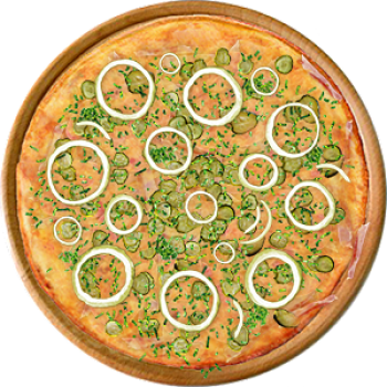 Основа: Традиционная (толстое тесто ⌀35см) (650 г) Соус: Соус белый (100 г) Топпинги: Ветчина (50 г), Сырное ассорти (50 г), Огурчики (50 г) Доп. топпинги: Зелень (10 г), Кунжут (10 г)