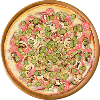 Основа: Итальянская (тонкое тесто ⌀35см) (400 г) Соус: Соус белый (100 г) Топпинги: Бекон (50 г), Ветчина (50 г), Копченые колбаски (50 г), Курица копченая (50 г), Шампиньоны (50 г), Огурчики (50 г) Доп. топпинги: - нет -