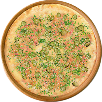 Основа: Итальянская (тонкое тесто ⌀35см) (400 г) Соус: Соус белый (100 г) Топпинги: Шампиньоны (50 г), Лосось (100 г), Окунь (филе) (100 г), Сырное ассорти (150 г) Доп. топпинги: Чёрный перец (10 г)