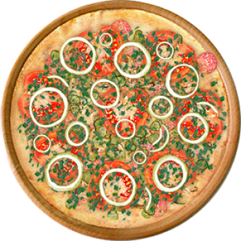 Основа: Традиционная (толстое тесто ⌀35см) (650 г) Соус: Соус белый (100 г) Топпинги: Копченые колбаски (50 г), Салями (50 г), Шампиньоны (50 г), Сыр (50 г), Огурчики (50 г), Помидоры (50 г) Доп. топпинги: Лук зелёный (20 г), Лук репчатый (35 г)