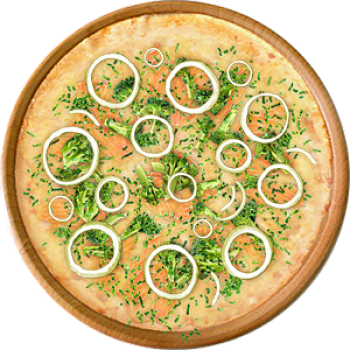 Основа: Традиционная (толстое тесто ⌀35см) (650 г) Соус: Соус белый (100 г) Топпинги: Брокколи (50 г), Лосось (100 г), Сырное ассорти (100 г) Доп. топпинги: Зелень (10 г), Лук репчатый (35 г)