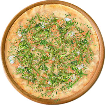 Основа: Традиционная (толстое тесто ⌀35см) (650 г) Соус: Соус белый (100 г) Топпинги: Лосось (50 г), Сыр (50 г), Сыр Филадельфия (50 г), Брокколи (50 г), Фасоль стручковая (50 г) Доп. топпинги: Зелень (10 г), Кунжут (10 г)