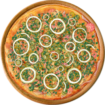 Основа: Итальянская (тонкое тесто ⌀35см) (400 г) Соус: Соус красный (100 г) Топпинги: Бекон (50 г), Ветчина (50 г), Копченые колбаски (50 г), Салями (50 г), Грибное ассорти (50 г), Сыр (50 г), Огурчики (50 г), Халапеньо (100 г) Доп. топпинги: Лук зелёный (20 г), Лук репчатый (35 г)