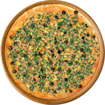Основа: Традиционная (толстое тесто ⌀35см) (650 г) Соус: Соус красный (100 г) Топпинги: Ветчина (50 г), Курица копченая (50 г), Сырное ассорти (50 г), Картофель фри (50 г), Кукуруза (50 г), Маслины (50 г) Доп. топпинги: Кунжут (10 г), Лук зелёный (20 г)