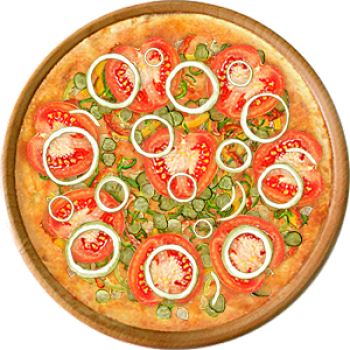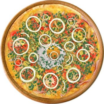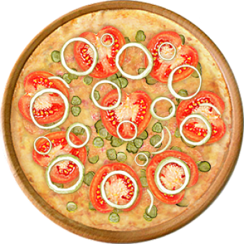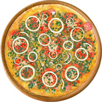 Основа: Традиционная (толстое тесто ⌀35см) (650 г) Соус: Соус красный (100 г) Топпинги: Курица копченая (50 г), Болгарский перец (50 г), Огурчики (50 г), Помидоры (50 г), Сыр (100 г) Доп. топпинги: Лук репчатый (35 г)