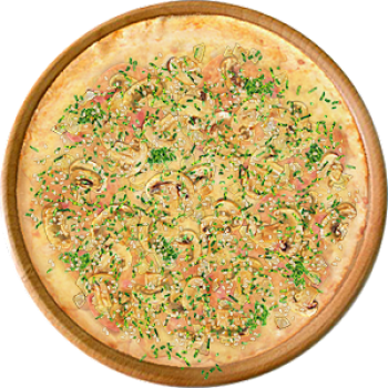 Основа: Традиционная (толстое тесто ⌀35см) (650 г) Соус: Соус белый (100 г) Топпинги: Ветчина (50 г), Курица копченая (50 г), Шампиньоны (50 г), Сырное ассорти (50 г) Доп. топпинги: Зелень (10 г), Кунжут (10 г)