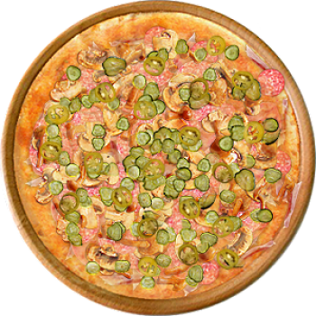 Основа: Традиционная (толстое тесто ⌀35см) (650 г) Соус: Соус красный (100 г) Топпинги: Бекон (50 г), Ветчина (50 г), Салями (50 г), Сыр (50 г), Огурчики (50 г), Халапеньо (50 г), Копченые колбаски (100 г), Грибное ассорти (100 г) Доп. топпинги: - нет -