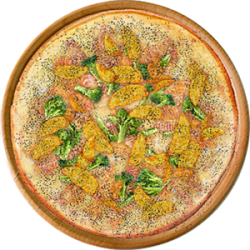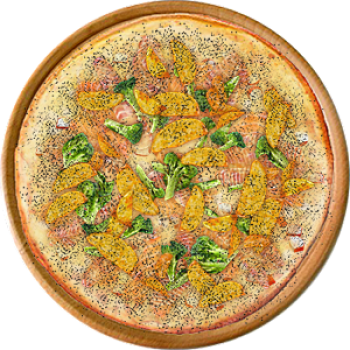 Основа: Итальянская (тонкое тесто ⌀35см) (400 г) Соус: Соус белый (100 г) Топпинги: Крабовые палочки (50 г), Лосось (50 г), Брокколи (50 г), Картофель по-деревенски (50 г), Окунь (филе) (150 г), Сырное ассорти (150 г) Доп. топпинги: Чёрный перец (10 г)