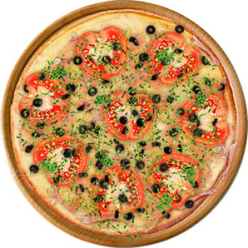 Основа: Итальянская (тонкое тесто ⌀35см) (400 г) Соус: Соус белый (100 г) Топпинги: Бекон (50 г), Курица копченая (50 г), Сырное ассорти (50 г), Маслины (50 г), Ветчина (100 г), Помидоры (100 г) Доп. топпинги: Зелень (10 г)