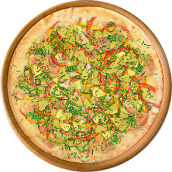 Основа: Традиционная (толстое тесто ⌀35см) (650 г) Соус: Соус белый (100 г) Топпинги: Ветчина (50 г), Курица копченая (50 г), Сыр (50 г), Огурчики (50 г), Помидоры (50 г) Доп. топпинги: - нет -