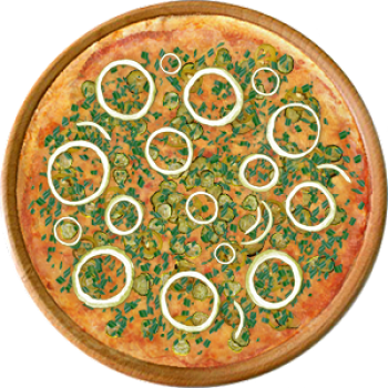 Основа: Итальянская (тонкое тесто ⌀35см) (400 г) Соус: Соус красный (100 г) Топпинги: Ветчина (50 г), Грибное ассорти (50 г), Сыр (50 г), Огурчики (50 г), Помидоры (50 г) Доп. топпинги: Зелень (10 г), Лук зелёный (20 г)