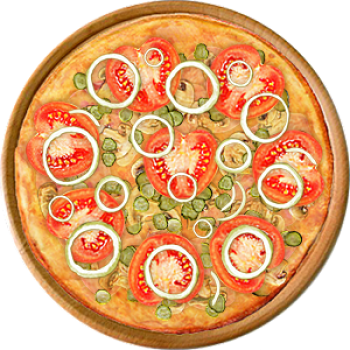 Основа: Итальянская (тонкое тесто ⌀35см) (400 г) Соус: Соус красный (100 г) Топпинги: Ветчина (50 г), Шампиньоны (50 г), Сырное ассорти (50 г), Огурчики (50 г), Помидоры (50 г) Доп. топпинги: Лук репчатый (35 г)