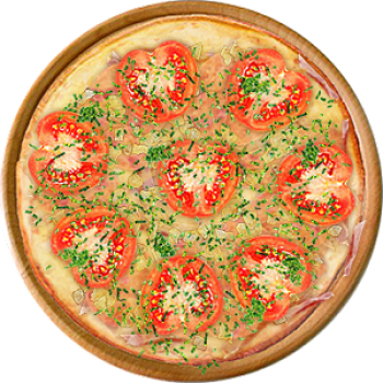 Основа: Итальянская (тонкое тесто ⌀35см) (400 г) Соус: Соус белый (100 г) Топпинги: Бекон (50 г), Курица копченая (50 г), Сырное ассорти (50 г), Помидоры (50 г), Ветчина (100 г) Доп. топпинги: Зелень (10 г)