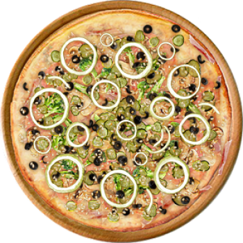 Основа: Итальянская (тонкое тесто ⌀35см) (400 г) Соус: Соус белый (100 г) Топпинги: Бекон (50 г), Ветчина (50 г), Шампиньоны (50 г), Сыр (50 г), Брокколи (50 г), Огурчики (50 г), Маслины (50 г) Доп. топпинги: Кунжут (10 г), Лук репчатый (35 г)