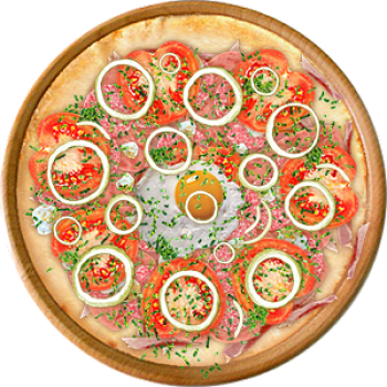 Основа: Традиционная (толстое тесто ⌀35см) (650 г) Соус: Соус белый (100 г) Топпинги: Балык (50 г), Бекон (50 г), Ветчина (50 г), Салями (50 г), Сыр Филадельфия (50 г), Помидоры (50 г), Яйцо куриное (50 г) Доп. топпинги: Зелень (10 г), Лук репчатый (35 г)