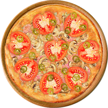 Основа: Итальянская (тонкое тесто ⌀35см) (400 г) Соус: Соус красный (100 г) Топпинги: Курица копченая (50 г), Салями (50 г), Шампиньоны (50 г), Сыр (50 г), Помидоры (50 г), Халапеньо (50 г) Доп. топпинги: - нет -