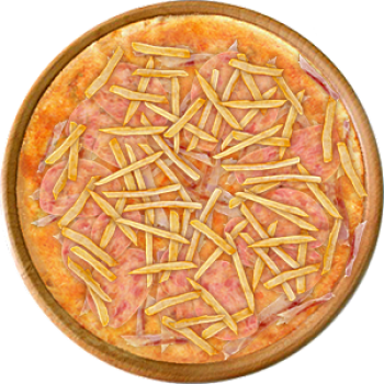 Основа: Традиционная (толстое тесто ⌀35см) (650 г) Соус: Соус красный (100 г) Топпинги: Ветчина (50 г), Сыр (50 г), Картофель фри (50 г), Бекон (100 г) Доп. топпинги: - нет -