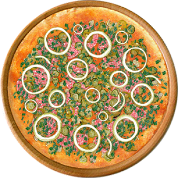 Основа: Традиционная (толстое тесто ⌀35см) (650 г) Соус: Соус красный (100 г) Топпинги: Курица копченая (50 г), Салями (50 г), Огурчики (50 г), Халапеньо (50 г) Доп. топпинги: Лук зелёный (20 г), Лук репчатый (35 г)